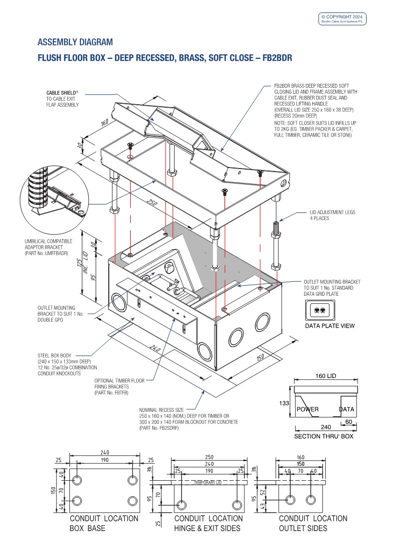 - Robust, large capacity cable exit flap with Cable Shield® and brass lifting handle.