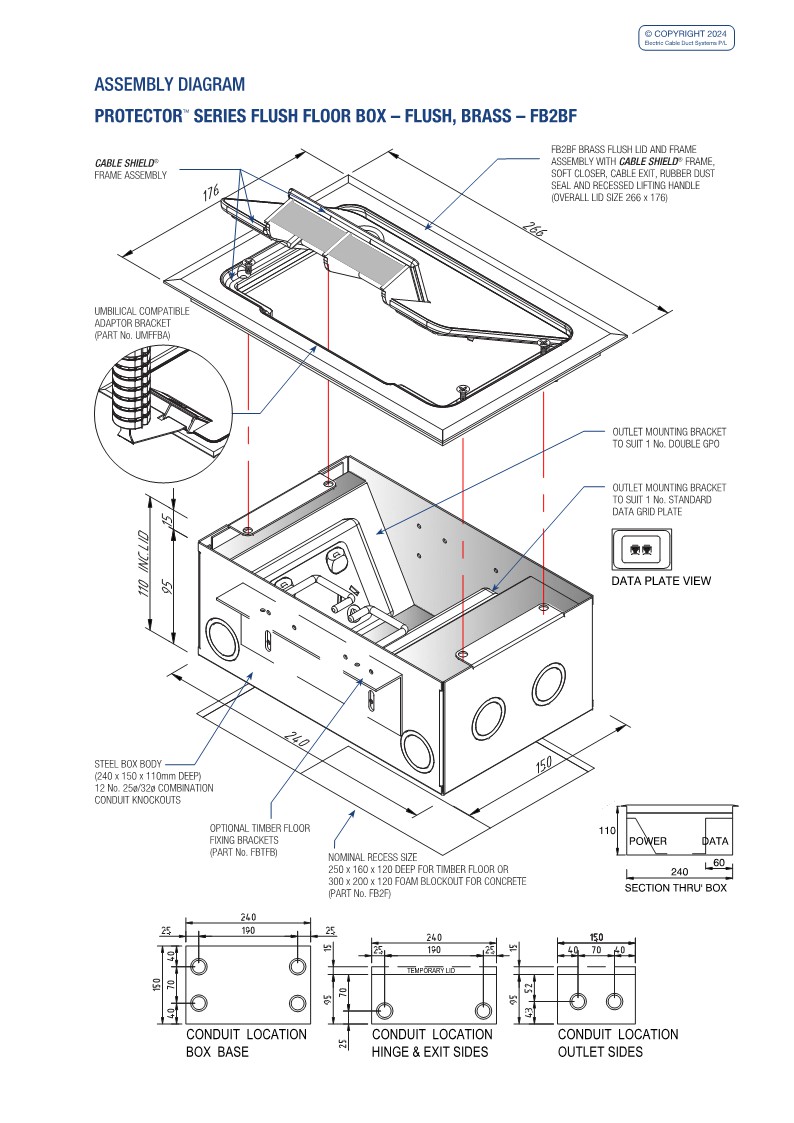 - Robust and large capacity cable exit flap with brass lifting handle.