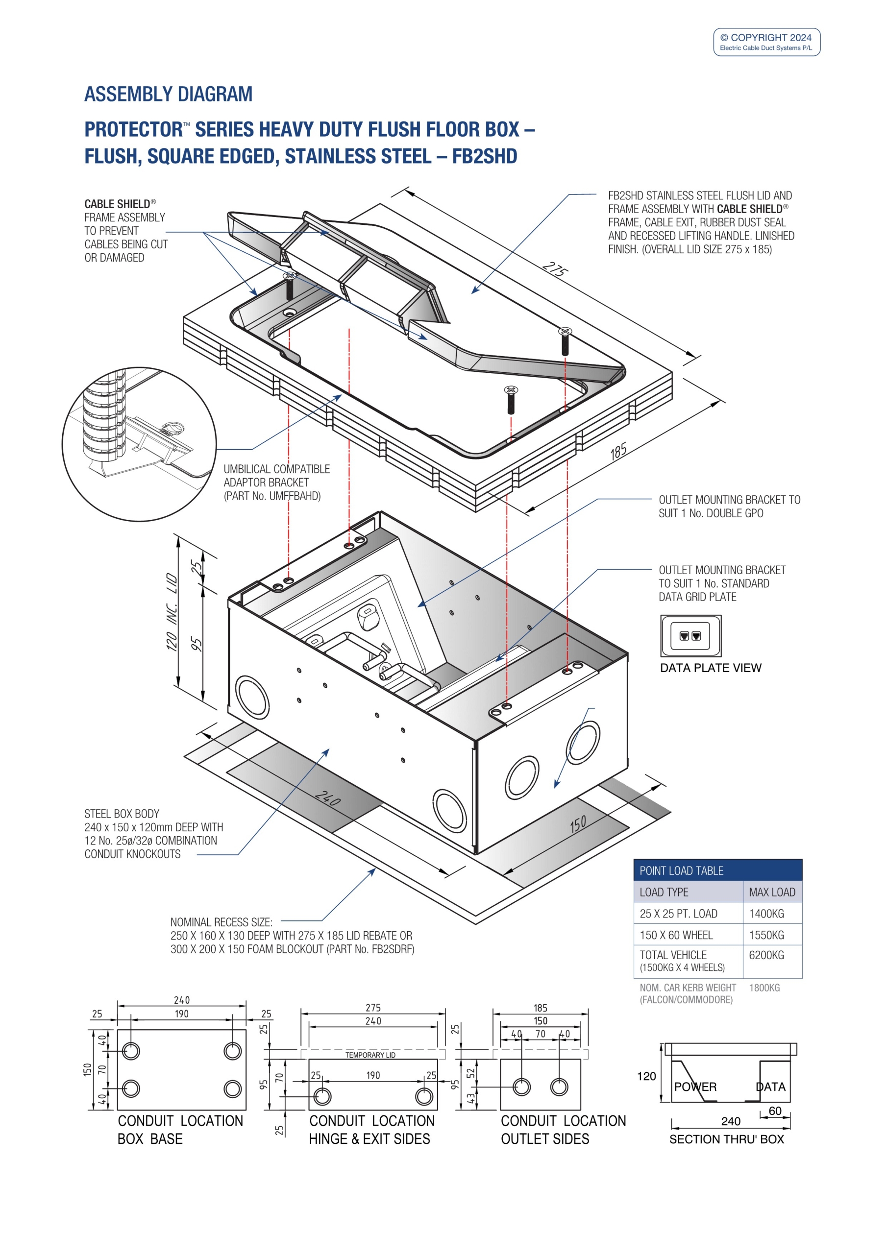 - Heavy duty – load rated floor box suitable for vehicular traffic.