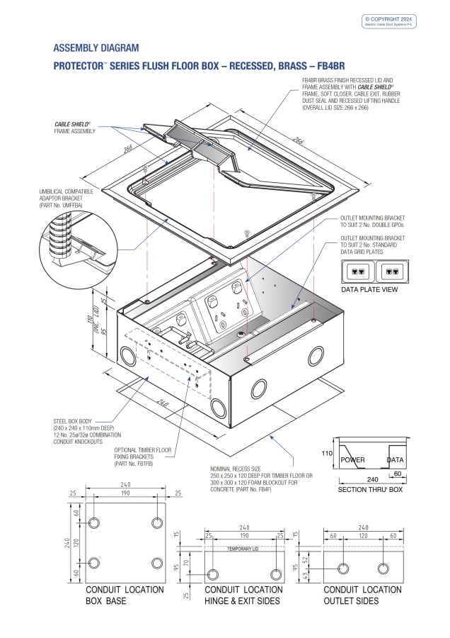 - Recessed Protector™ Series brass finish lid and frame with 6mm rebate for floor finish (typically carpet or vinyl).