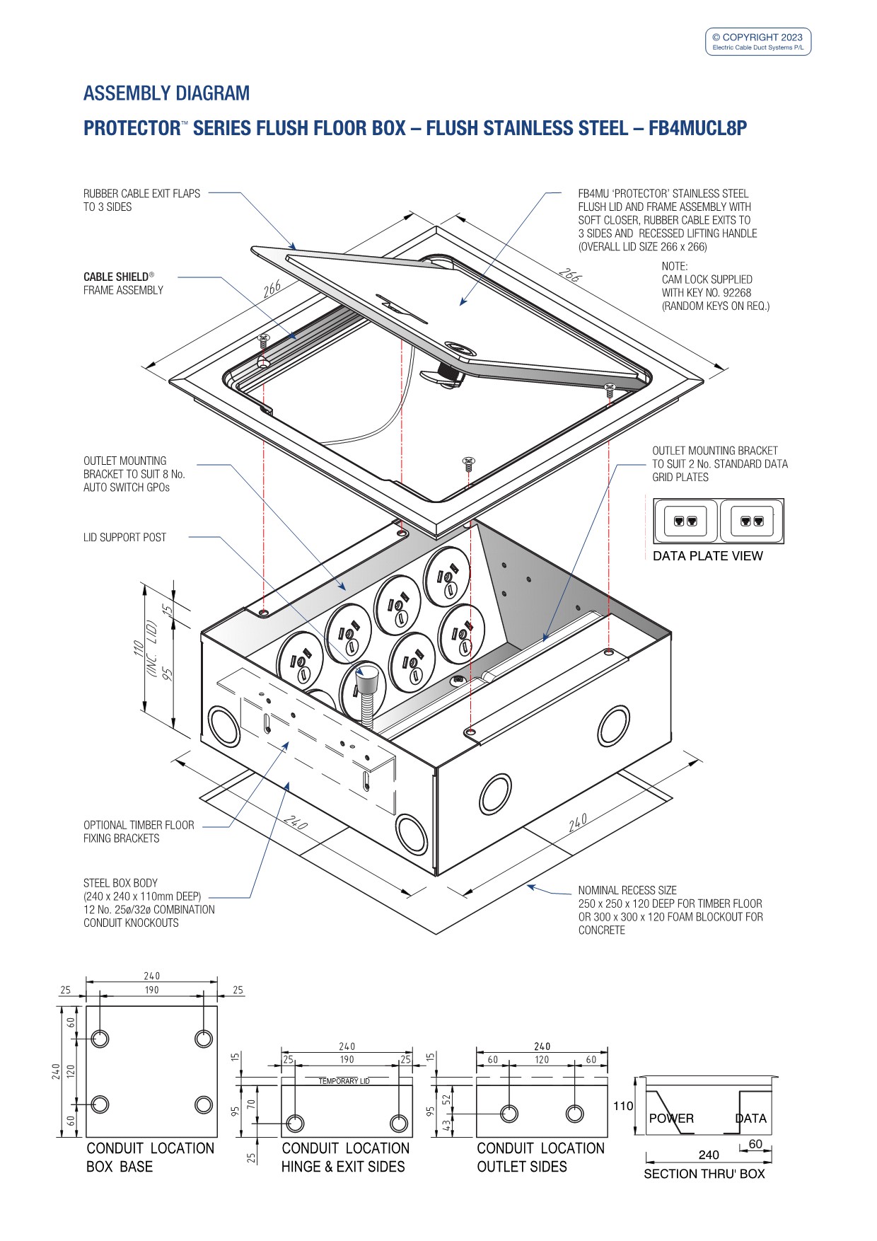 - A lockable floor box supplied with cam lock fitted. Cam locks can be keyed alike to key number 92268 or randomly keyed.
