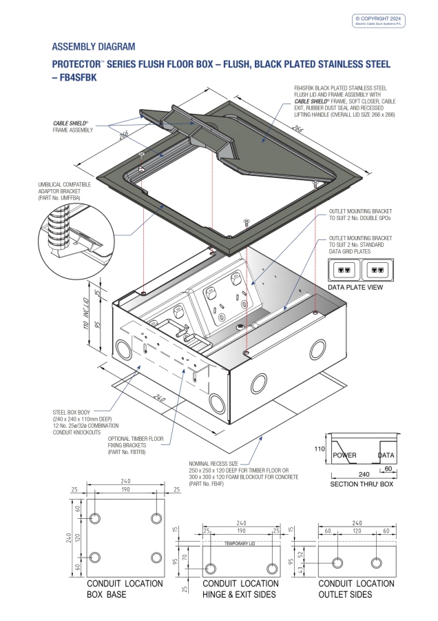 - Capacity for 4 standard outlet plates (2 x double power & 2 x Data and/or A.V.).