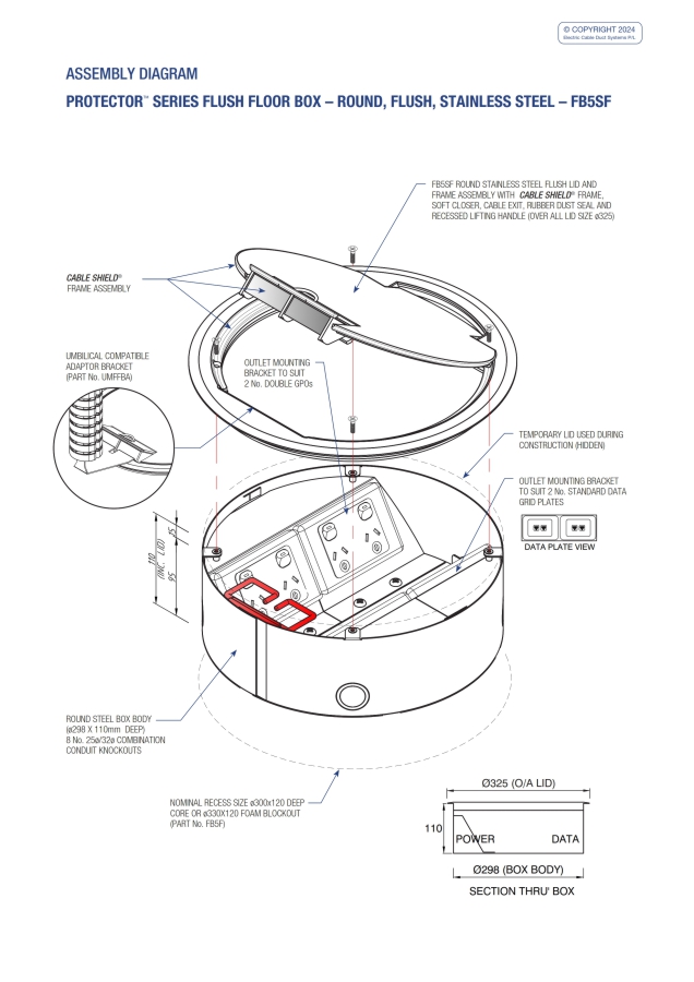 - The circular design of the canister and lid allows this box to be installed into existing concrete slabs. Simply core cut the appropriate size core hole and drop the floor box into position. No need to over cut and scabble square holes.