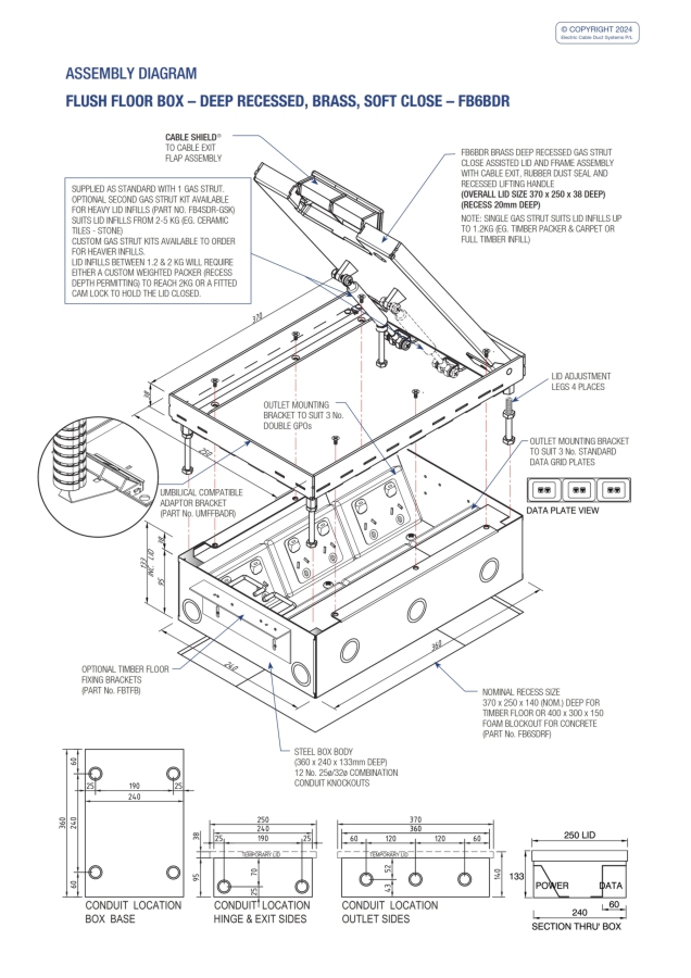 - Robust, large capacity cable exit flap with Cable Shield® and brass lifting handle.