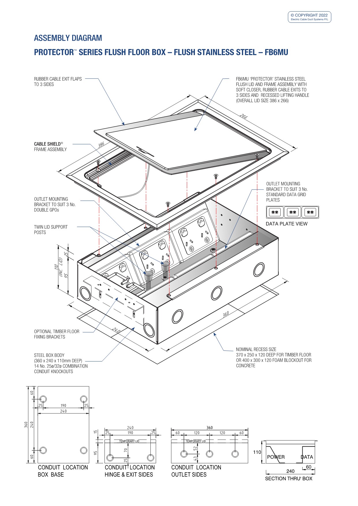 - Modular box body and lid design, interchangeable with plastic and other lids in the ECD® floor box range.