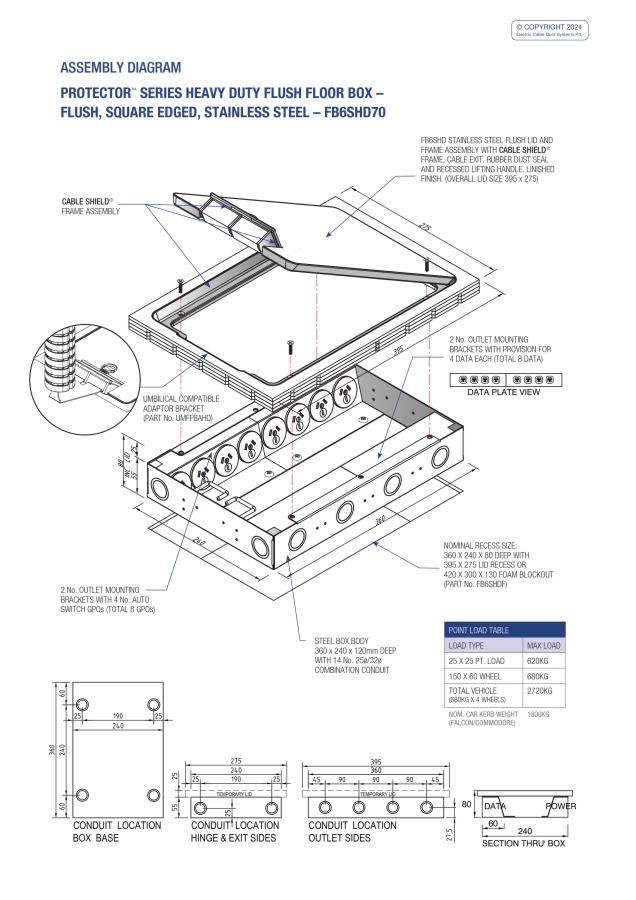 - Heavy duty – load rated floor box suitable for vehicular traffic.