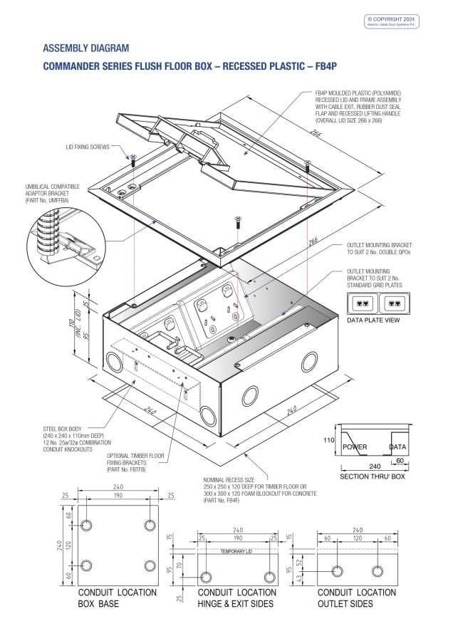 - Capacity for 4 standard outlet plates (2 x double power & 2 x Data and/or A.V.).